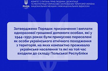 Затверджено Порядок призначення і виплати одноразової грошової допомоги особам, які у 1944–1951 роках були примусово переселені як особи українського етнічного походження з територій, на яких компактно проживало українське населення та які на той час входили до складу Польської Республіки